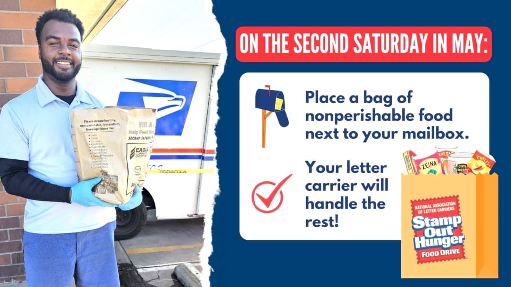 To donate, just place a box or can of non-perishable food next to your mailbox before your letter carrier delivers mail on the second Saturday in May. The carrier will do the rest. The food is sorted, and delivered to an area food bank or pantry, where it is available for needy families.